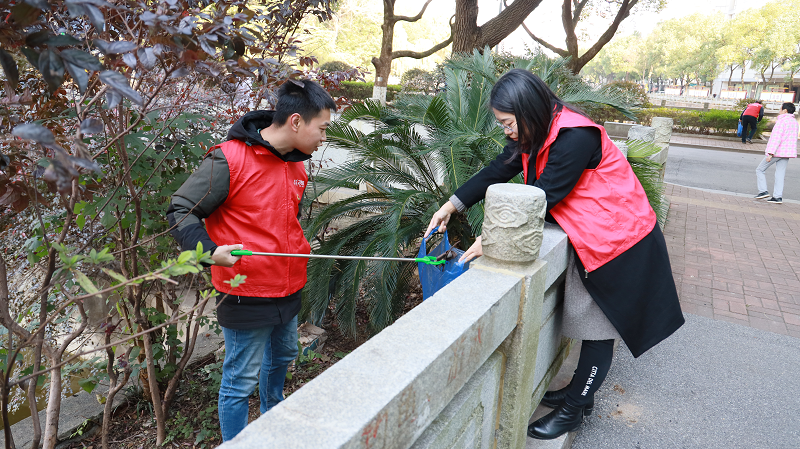 活動(dòng)中,黨員志愿者們充分展現(xiàn)了不怕臟、不怕苦、不怕累,敢于沖在前面、敢于搶挑重?fù)?dān)的精神風(fēng)貌。向陽湖內(nèi)側(cè)綠化帶因有石板護(hù)欄隔離,存在多處衛(wèi)生死角,清理垃圾非常不便。年輕黨員志愿者主動(dòng)認(rèn)領(lǐng)任務(wù),迅速組團(tuán)配對(duì),有的爬過護(hù)欄跳入綠化帶內(nèi)進(jìn)行清理,有的在旁傳遞垃圾袋,有的一手提著垃圾袋,一手拿著垃圾夾子,對(duì)蓉園路沿線及南海賓館前坪的塑料袋、煙蒂、電池、玻璃瓶等不易降解的有毒有害垃圾進(jìn)行清理。